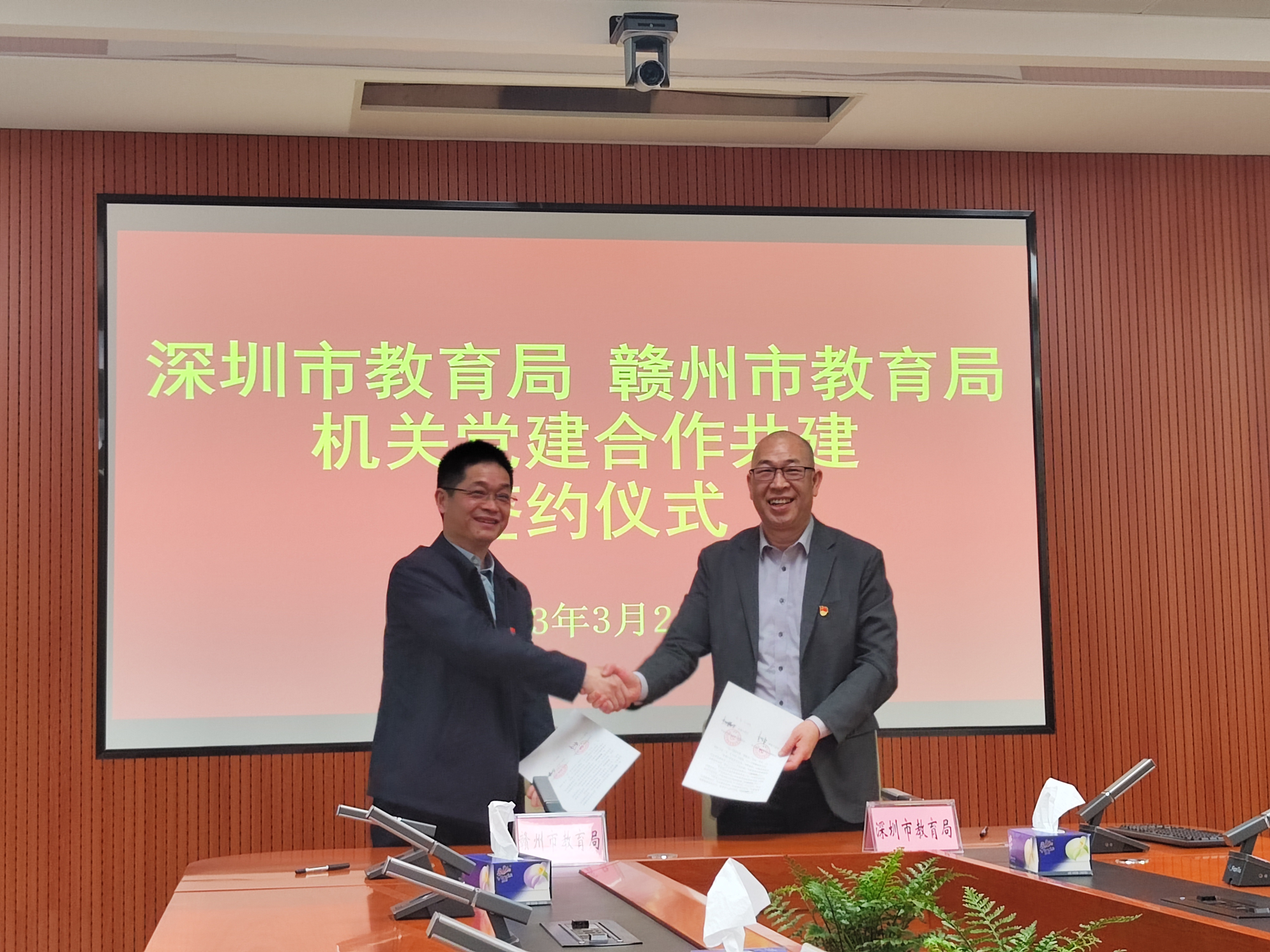 在深圳市教育局,胡敦祥一行与深圳市委教育工委副书记、深圳市教育局机关党委书记杨平及机关党委(人事处)负责同志进行了座谈交流。双方明确,以签约共建为契机,深入贯彻落实《深圳市与日博365娱乐场_BET3365手机下载_best365网页版登录官网对口合作实施方案(2023-2027年)》精神,建立机关党建合作共建工作机制,积极开展组织共建、队伍共育、典型共树、履职共促、活动共办、群团共建,提高双方机关党建工作水平。双方商定,将于每年年初进行会商,制订年度合作交流、共建共享计划;充分发挥结对共建双方机关党组织的优势,常态化交流党的组织建设工作经验;组织党员代表在深圳或赣州共同过组织生活,共同开展“三会一课”、党员培训和党日活动;适时组织两地教育系统的优秀党员、先进模范举办座谈会、分享交流会、先进事迹报告会,鼓励两地党员创先争优,发挥先锋模范作用;发挥共建平台优势,携手研究两地教育发展需求、教育改革等课题,加强沟通合作,促进信息互通、工作互信、发展互利、成果共享。同时,双方明确,赣州方面将充分发挥红色资源优势,为深圳市教育局机关和直属单位党员干部来赣州开展革命传统教育和红色研学活动提供必要的支持和帮助;深圳方面将充分发挥地处我国改革开放最前沿优势,为日博365娱乐场_BET3365手机下载_best365网页版登录官网教育局机关和直属单位党员干部到深圳参观考察和学习培训提供必要的支持和帮助。